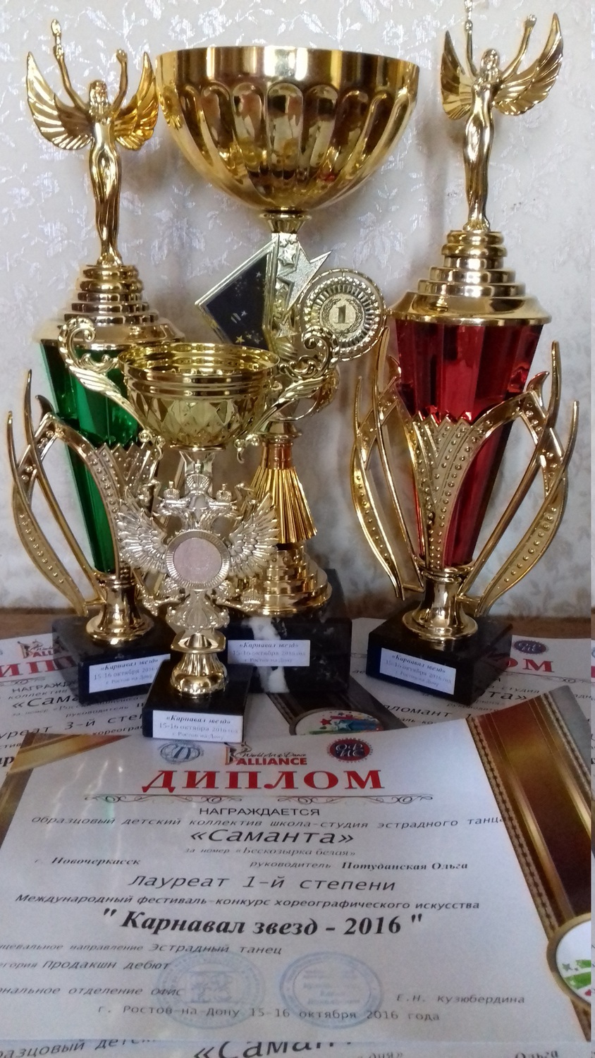 - В номинации танцевальное шоу юниоры формейшн номер "Россия - матушка" удостоин кубком и дипломом лауреата 3-ей степени,
